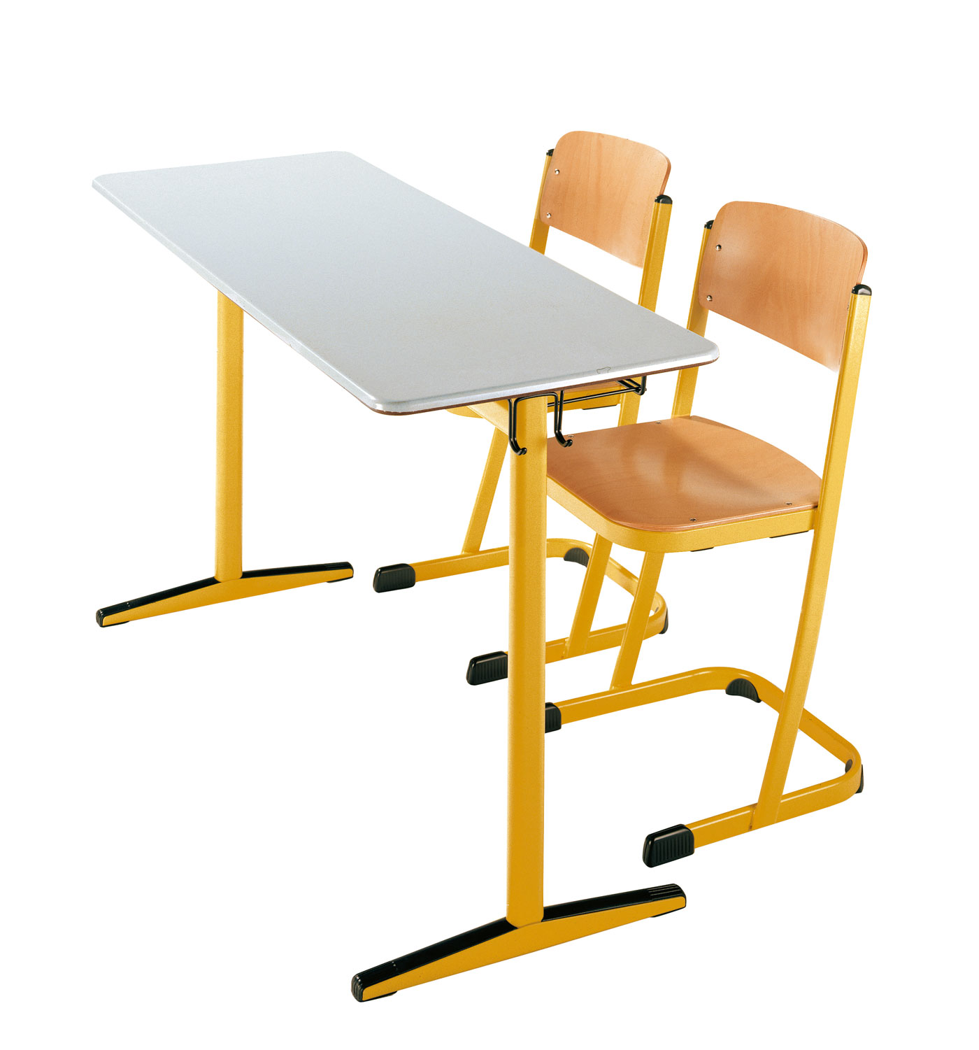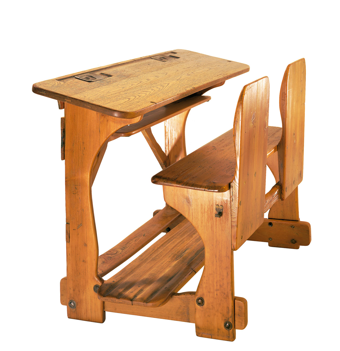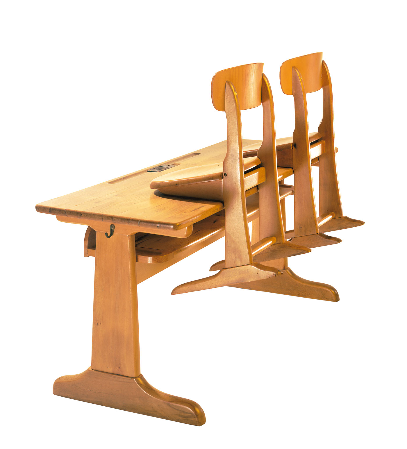 The lightly overlapping school table top and seat (known as “minus distance”) allowed for economy of space between benches.