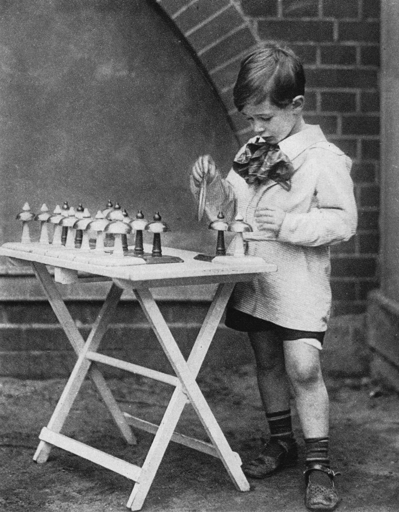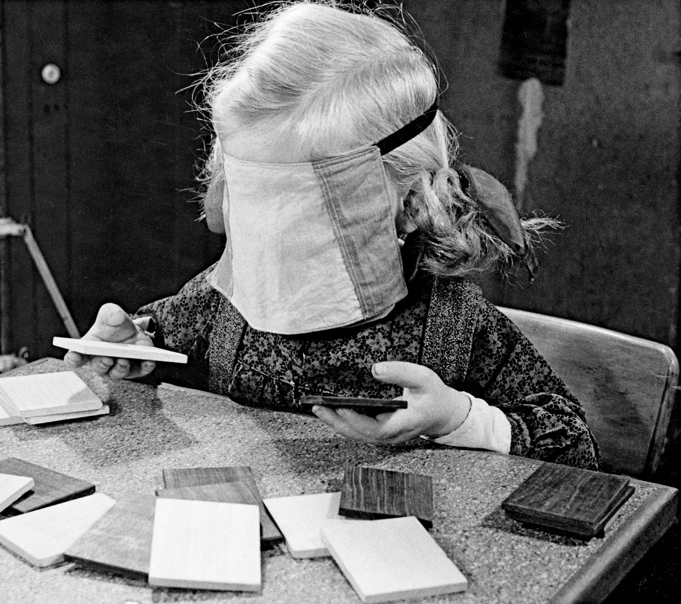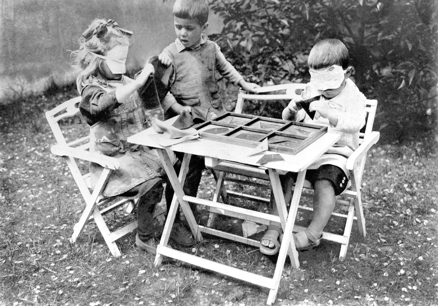 A boy is feeling the contours of geometric shapes. Blindfolded he feels around the figures with fore and middle finger to understand the shape. Children’s House, Berlin, around 1920