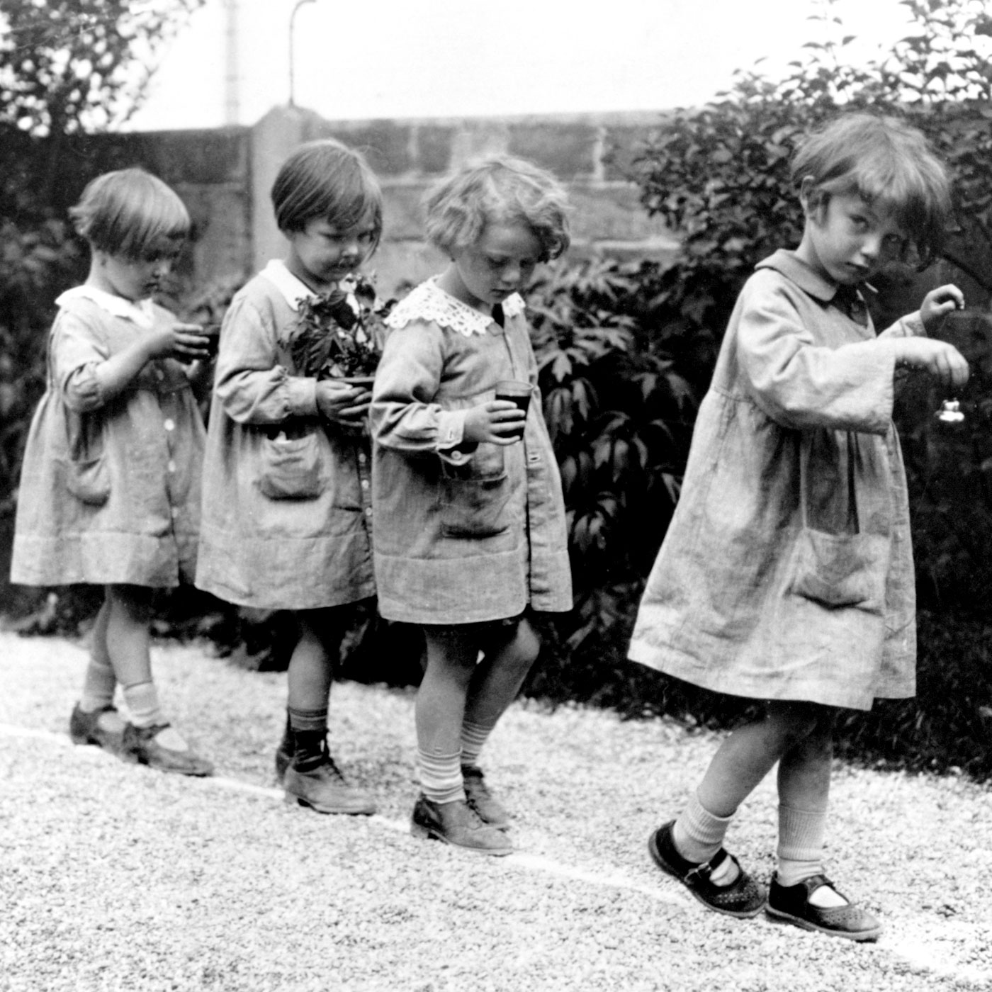 The first rhythmic exercises are for balance. Walking along a line encourages conscious coordination of movement. Children’s House, Vienna, 1935.