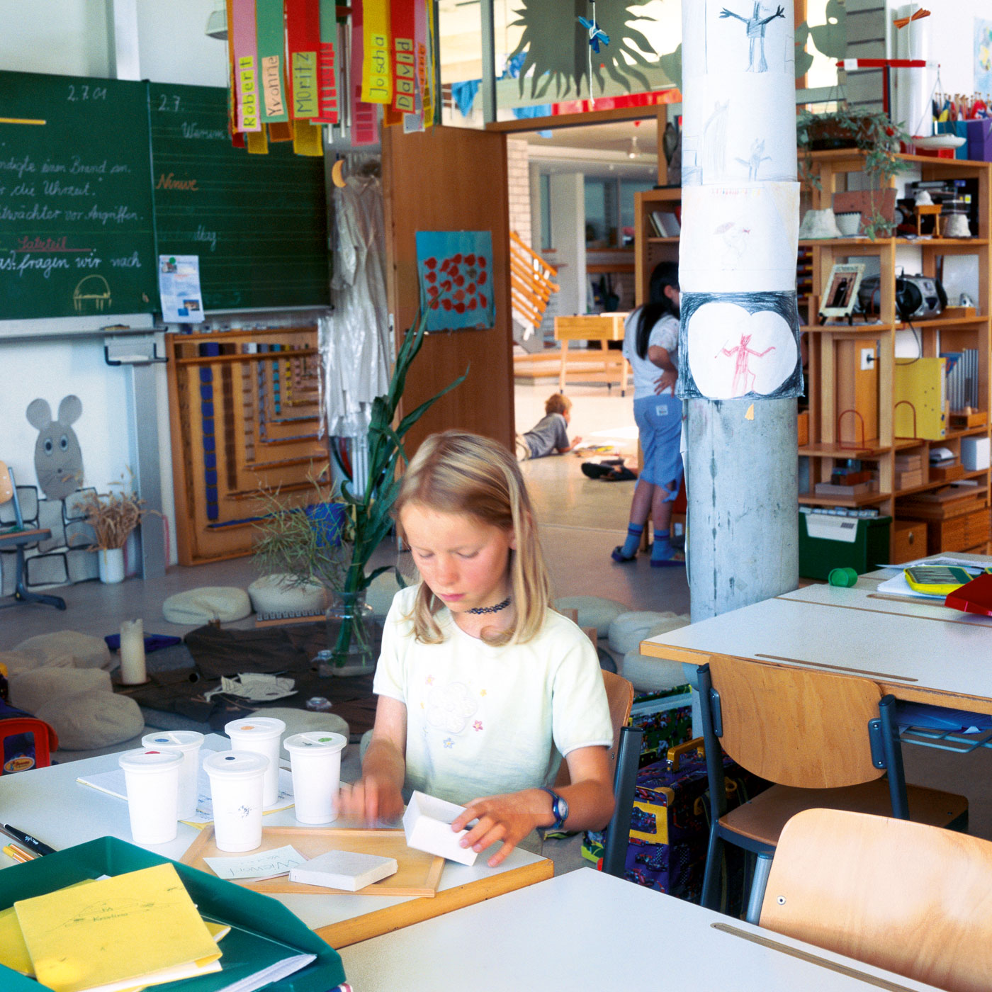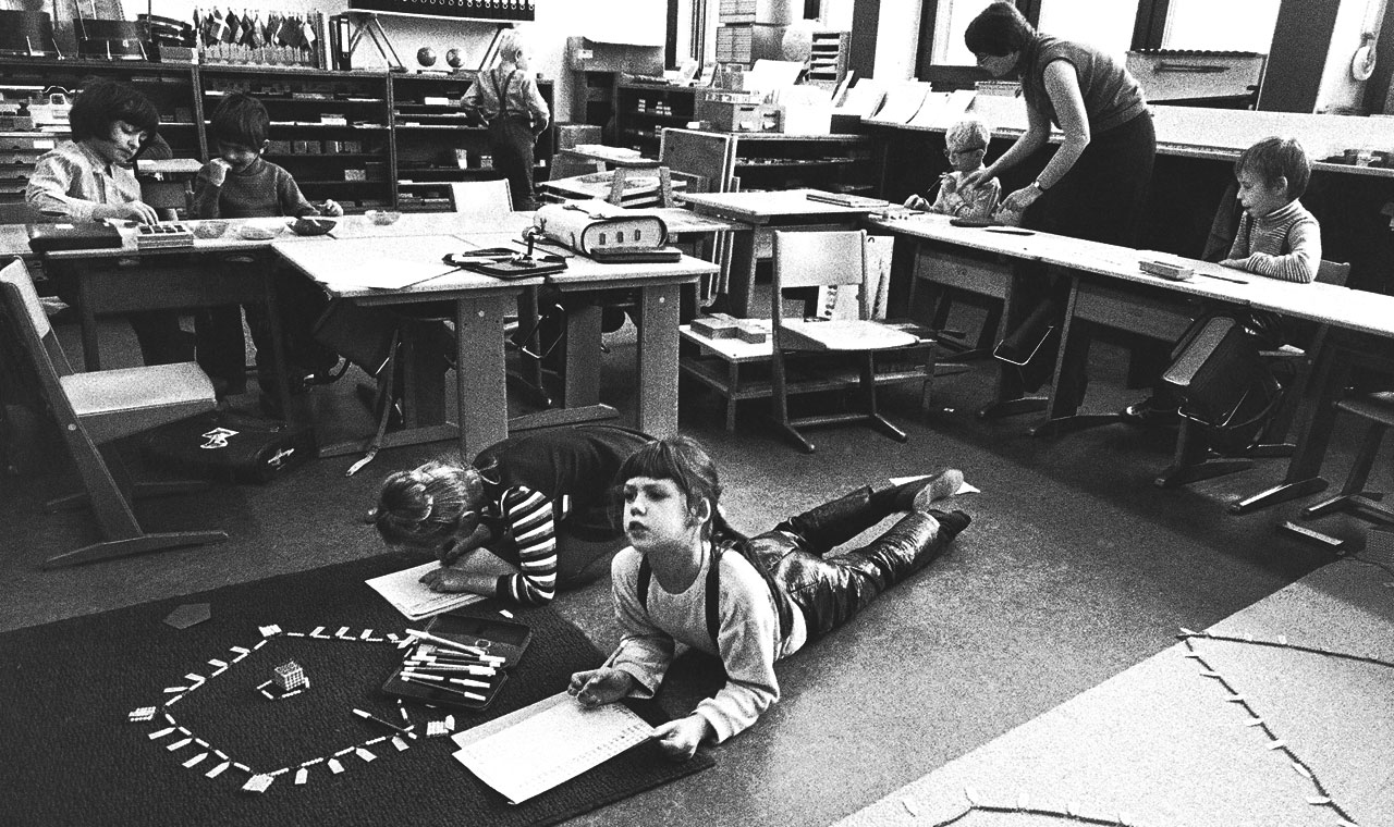 Montessori education takes into account the whole character/personality of the young person. What the school offers is especially designed to do justice to that concept. On the shelves, Montessori materials are available to choose from. The work tables are arranged in a loose way, the largest part of the room is left freely available to the children. The teacher goes where she is needed and helps when necessary. The children are absorbed in the work they have chosen for themselves, every child is working independently and on their own initiative. Munich, Integrative Montessori school “Action Sunshine”, 1972