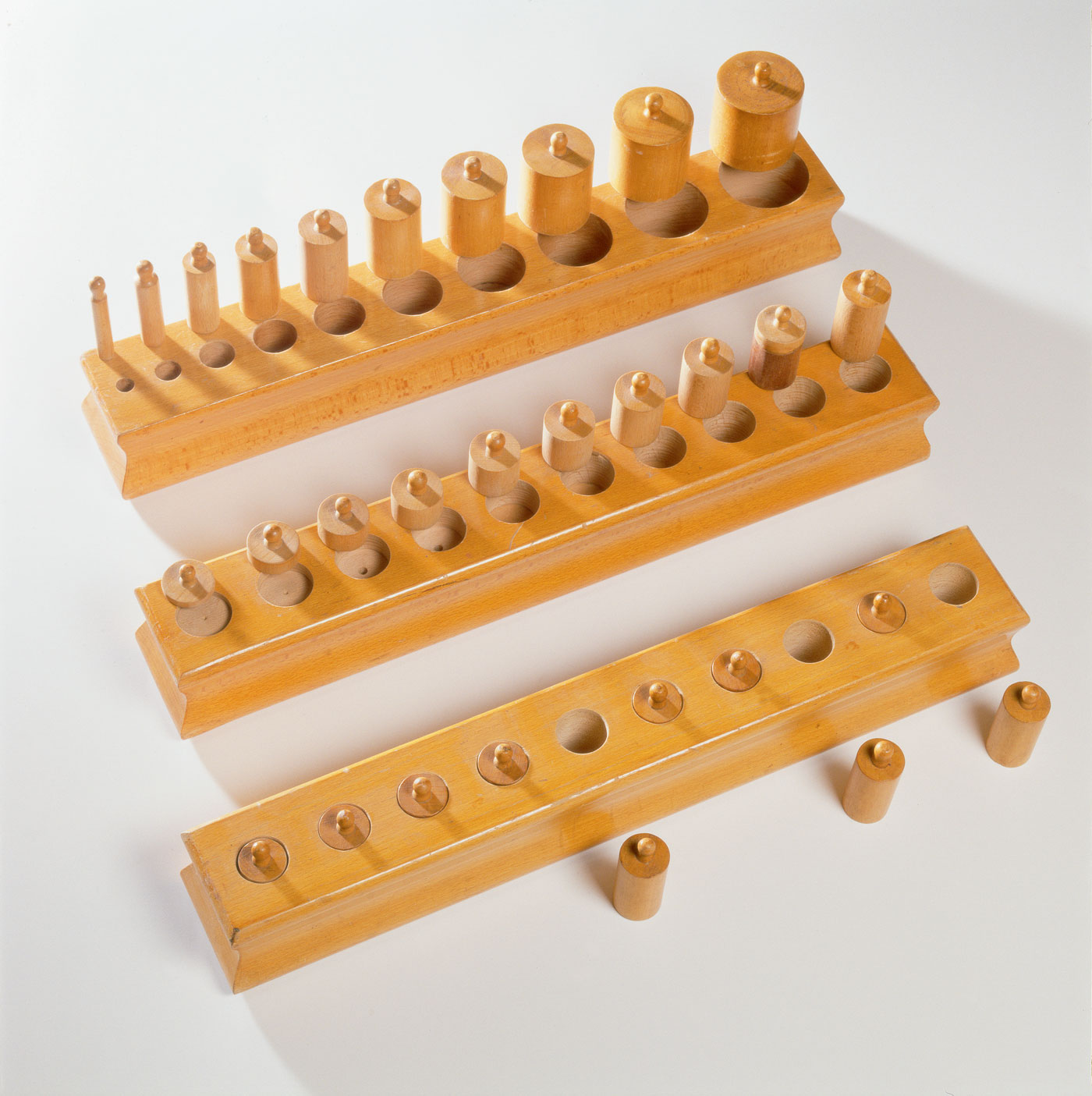 Practice material with different kinds of cylinders to insert in a block – same-dimension cylinders and others with different diameters and decreasing heights.