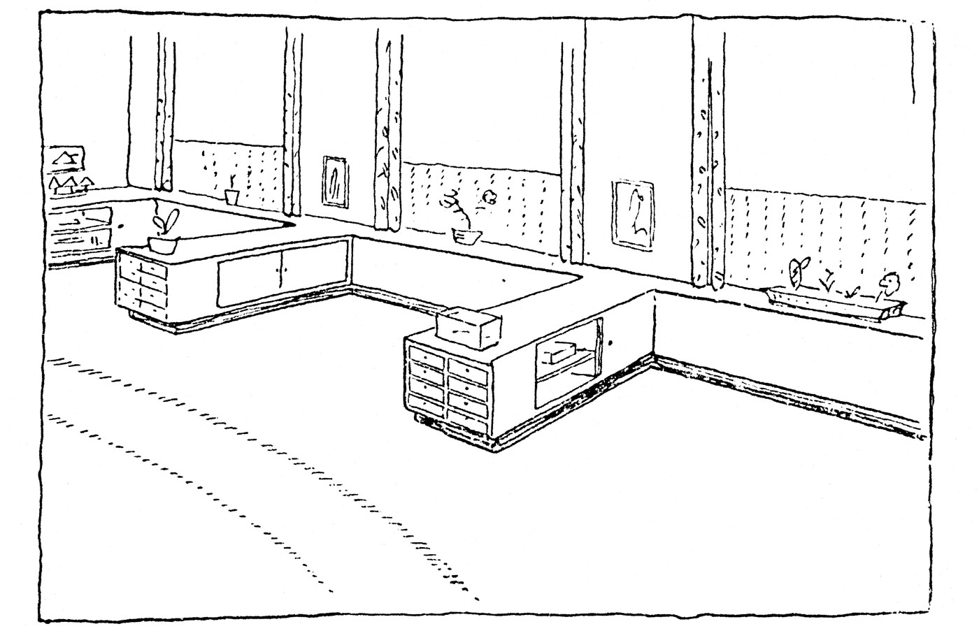 Friedrich Benoit’s drawings for a Children’s House. From the windows inwards, the room is divided by low, built-in units usable on both sides. This allows objects and teaching materials to be placed in a clearly ordered way.