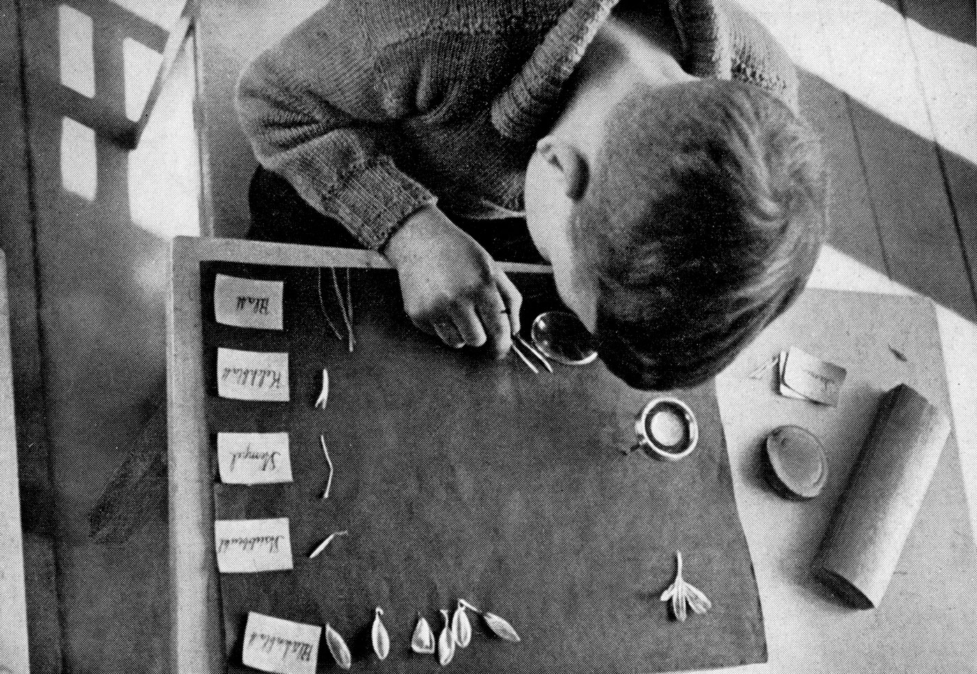 Cosmic education includes nature, culture and society. The boy studies the composition of a flower with tweezers and magnifying glass and arranges the individual parts on the labeled card. Montessori School, Aachen, around 1930.