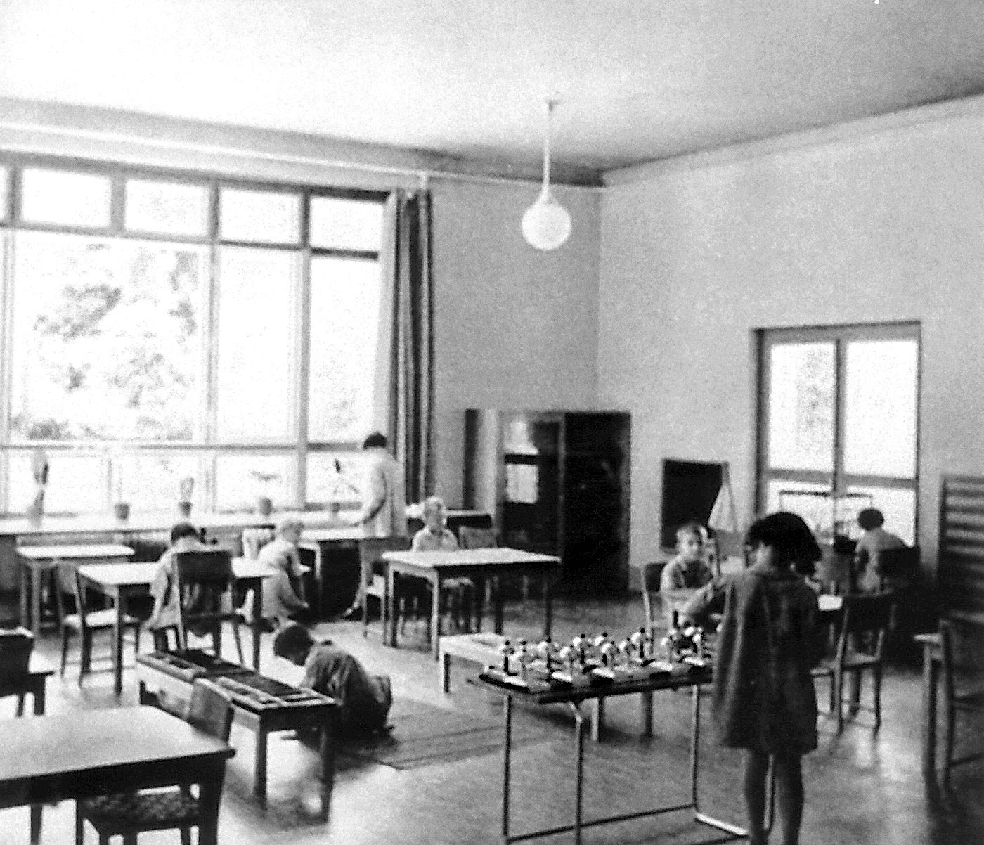 At the beginning of the 20th century an Italian physician, Maria Montessori, started to develop reform of education for infants and elementary school children. Her concern was that children should be supported in discovering for themselves their strengths and abilities and that these needed to be facilitated. Learning materials but also furniture and architecture were to be oriented to that purpose. Montessori classroom, Berlin-Tempelhof, 1955.