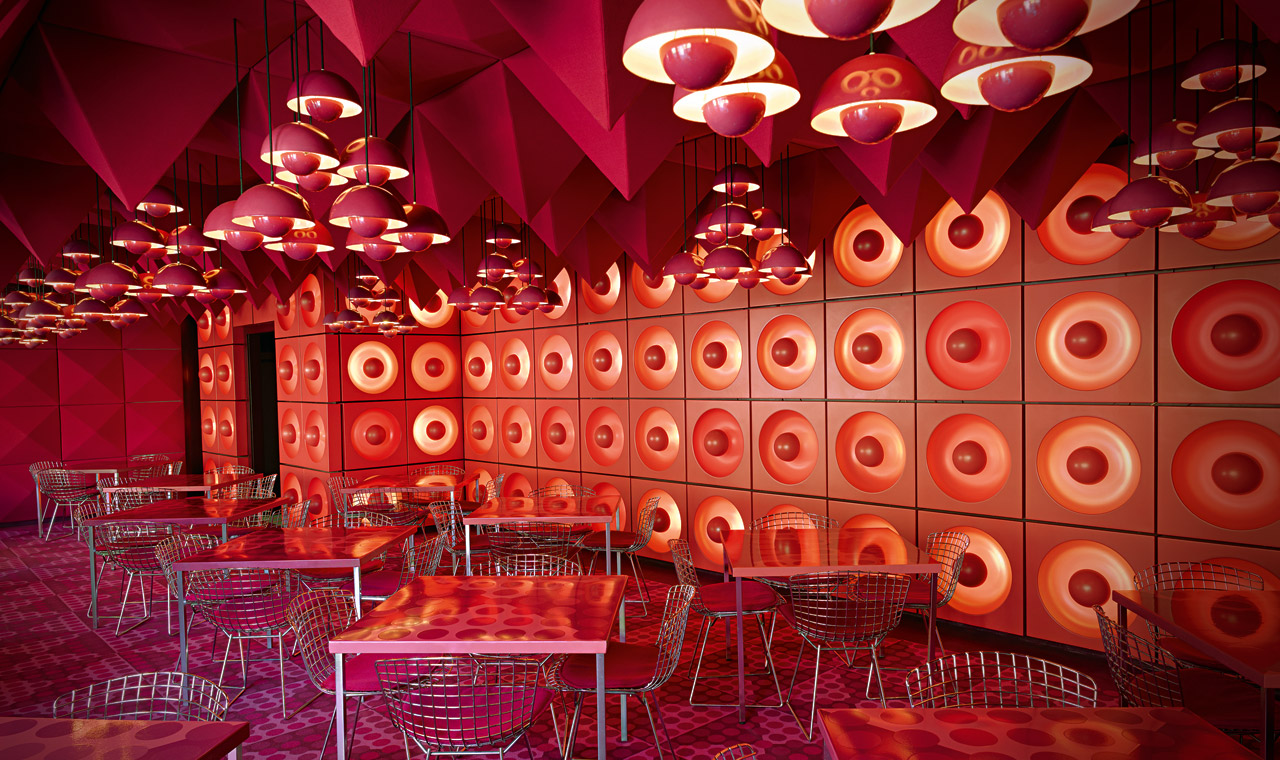 Spatial concept, translated into a serial principle: Visual phenomena were transcribed in the textile design. Wall, floor and ceiling were all of equal importance for designer Verner Panton – they all contribute to the overall space concept.