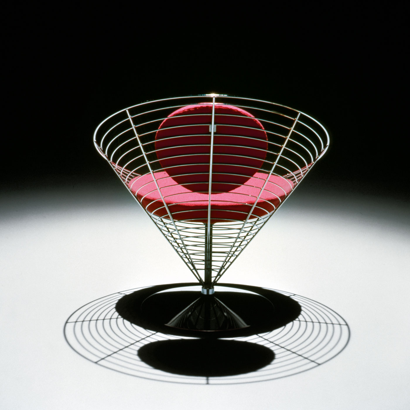 Conceived as a variant of the cone chair, the wire cone consistently broke all the rules of chair design – in the use of wire as a visible material, in its unconventional cone shape and open design: A chair that seems to be growing out of the ground.